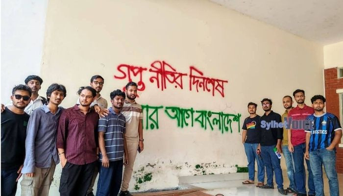 শাহজালাল বিজ্ঞান ও প্রযুক্তি বিশ্ববিদ্যালয় (শাবিপ্রবি) ক্যাম্পাসে ‘গুপ্ত রাজনীতি’র বিরুদ্ধে প্রতিবাদ জানিয়ে দেয়াল লিখন কর্মসূচি পালন করেছে বিশ্ববিদ্যালয় শাখা ছাত্রদল।